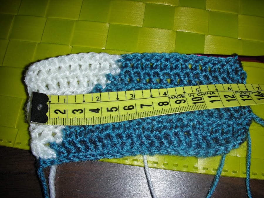 Continuamos así hasta que la muestra mida 13 cm. Si lo habéis hecho bien la muestra os quedará como en la foto es decir, la última vuelta completa en color amarillo maiz.