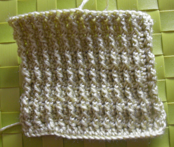 *echamos la hebra sobre el ganchillo y lo introducimos de delante hacia atrás y de derecha a izquierda alrededor del punto alto en relieve de la vuelta anterior y completamos el nuevo P.A de la forma habitual. A esto se le llama Punto Alto en Relieve delante de la labor (pard).