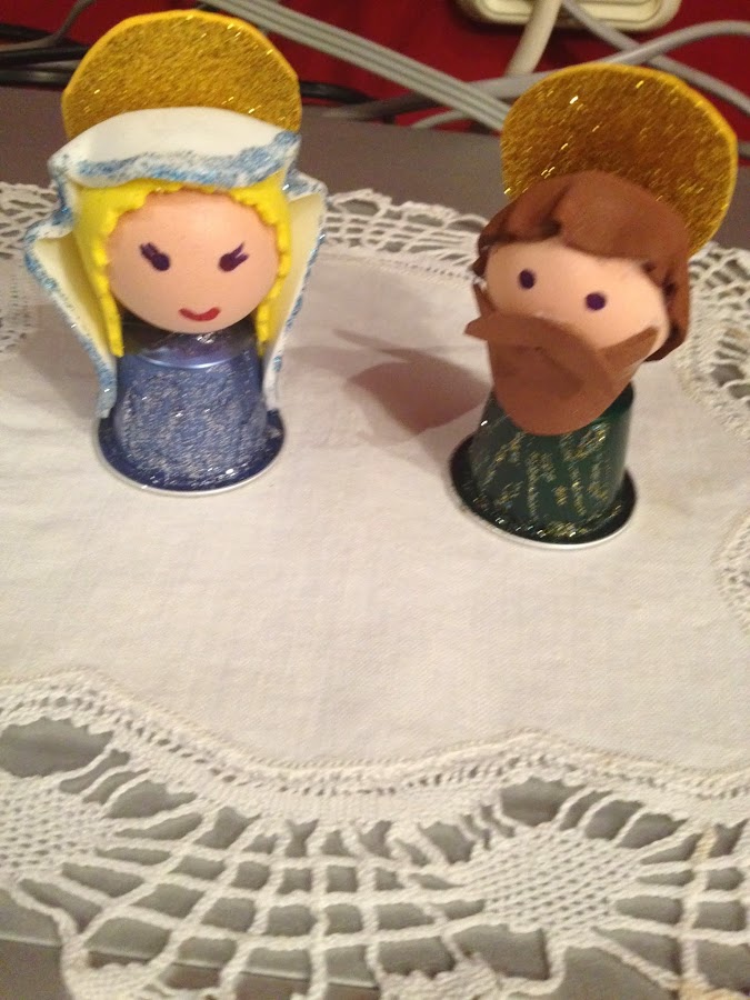 Una capsula Nespresso, vaciada y lavada azul cielo para la Virgen y una verde para San José, puedes utilizar los colores que más te gusten.