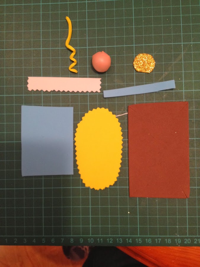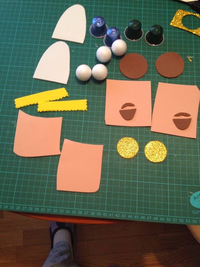Goma Eva o foamy: color carne, blanco, marrón, amarillo, azul cielo, purpurina oro.