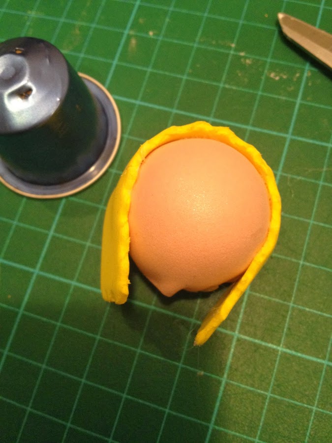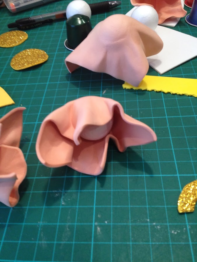 Pon la plancha a temperatura moderada y sin vapor, pásala sobre el trozo de color carne y en cuanto se ponga blandito, verás como se "abomba", pon la bola de corcho blanco en su interior, inmediatamente tira de los picos hacia abajo, rodeando la bola, sujétala entre tus dedos hasta que la goma eva se enfrié, así mantendrá la forma.