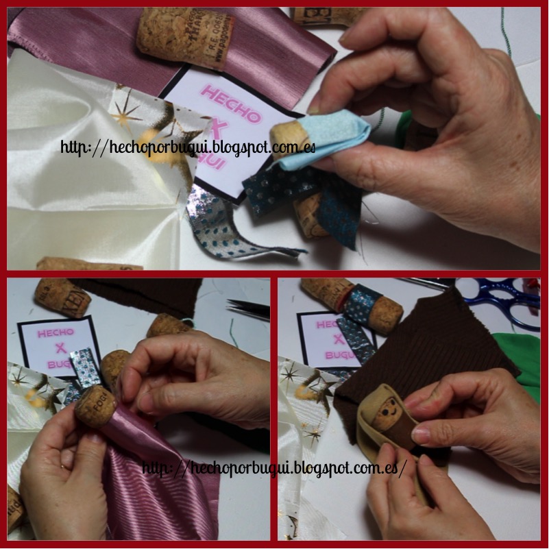 Corta un cuadrado de tela, dobla 1/2 cm. y pega en el corcho. Gira una punta de la forma que ves y pega.