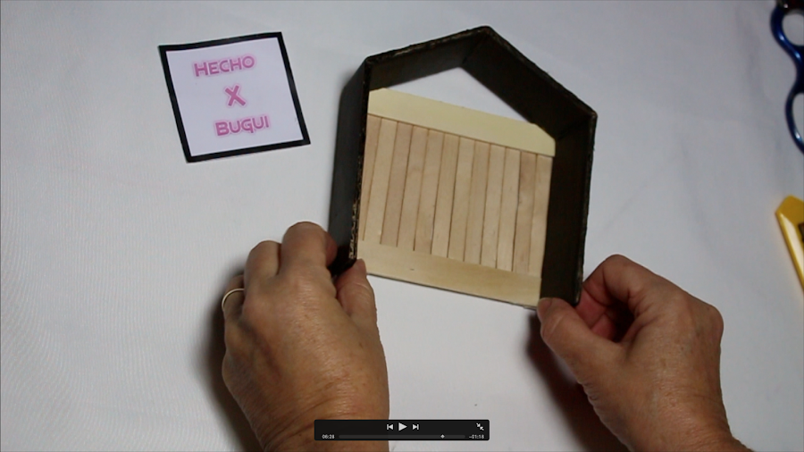 Para el portal pegaremos unos palitos de madera y un trozo de cartón.