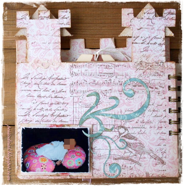 Pero la mami de una niña de la clase de mi peque,necesitaba hacer un regalo a una compañera de trabajo que acaba de tener un bebé y aprovecho para desde aqui agradecerle que pensara en mi para que se lo hiciera, gracias por la confianza y la libertad para elegir papeles y diseño...lo que me dijo que si tenía claro es que quería un álbum con la estructura de castillo que ya os enseñé en otra entrada, y que también fue un encargo; una estructura diseñada por mi y que se compone de varias páginas, que sobrepuestas una sobre otra,hacen un album desestructurado muy bonito.