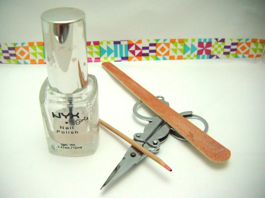 Esmalte transparente, tijeras, una lima de uñas, un palito de madera delgadito