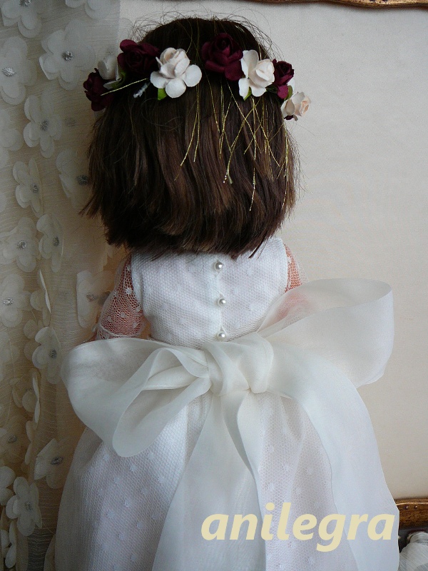Para romper un poco tanto blanco roto , valga la redundancia , el toque de color se lo puse en la coronita de rosas que lleva en la cabeza