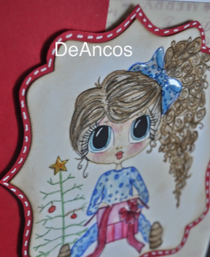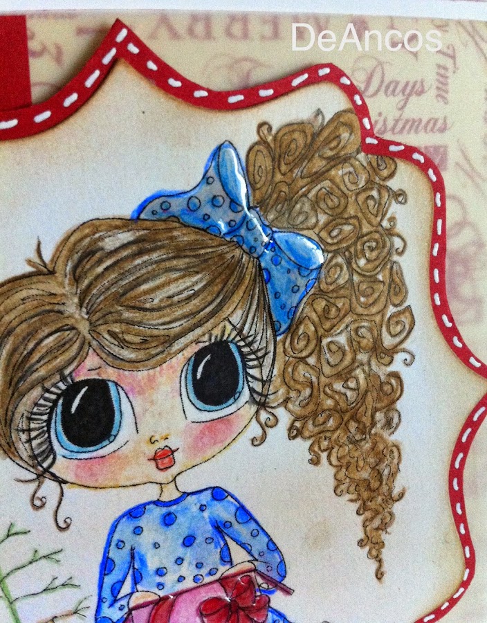 Sobre el papel decorado con motivos navideños he pegado papel vegetal para matizar los colores (además me encanta el efecto que hace). El resto ya se ve: el digi de ByBestie troquelada en blanco y entintada con Vintage Sepia, después de colorearla, sobre una cartulina color vino tinto que le sirve de marco. Me ha parecido oportuno aplicar Glossy en el lazo del pelo de la muñequita y en el lazo de la caja del regalo para conseguir un efecto 3D en esos puntos.
