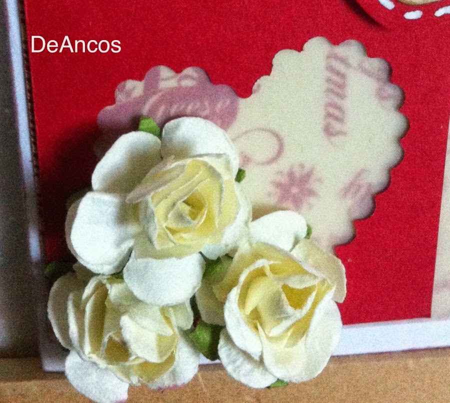 El corazón troquelado está bordeado con liquid pearl y el negativo que me ha quedado al troquelar, lo he utilizado para colocar el bouquet de rositas color marfil.