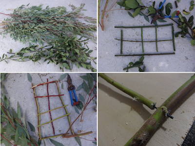 Para la ventana he ido a cortar algunas ramas, que frecuentemente se podan por ser las que crecen en la parte baja de los arboles. Probé con ramitas de eucalipto y laurel, ambas son aromáticas, corte tratando de encontrar simetría con la forma de la ventana y sin seguir una medida precisa