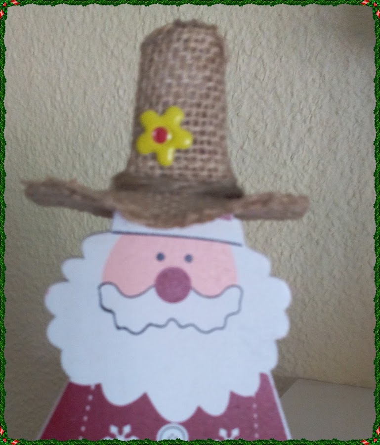 Las Navidades pasadas, le compré a mi hermana un calendario de adviento que era este papa Noel. Cuando pasaron las Navidades me dijo que ella no quería guardarlo, que le daba pena, es que tengo una hermana que se encariña con todo....Me pidió que le hiciera "algo" para que pudiese tenerlo el resto del año encima de la estantaría donde lo había colocado,así que se me ocurrió hacerle el sombrero que veis.