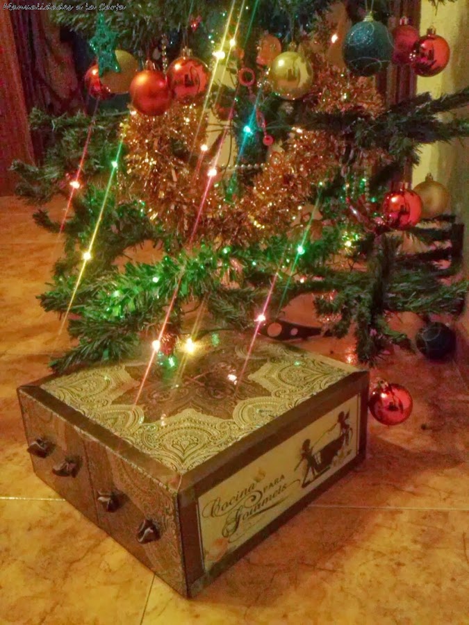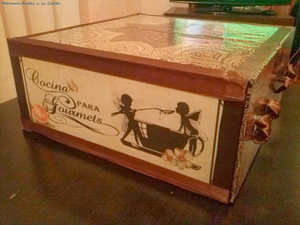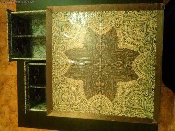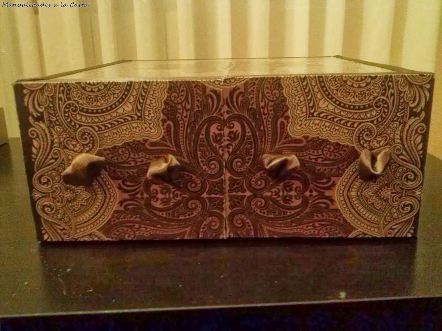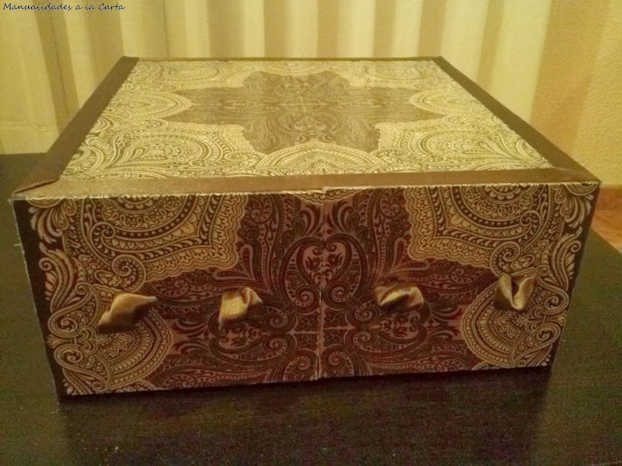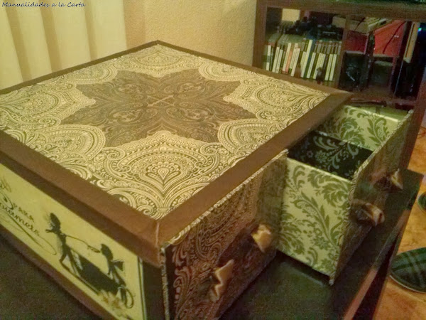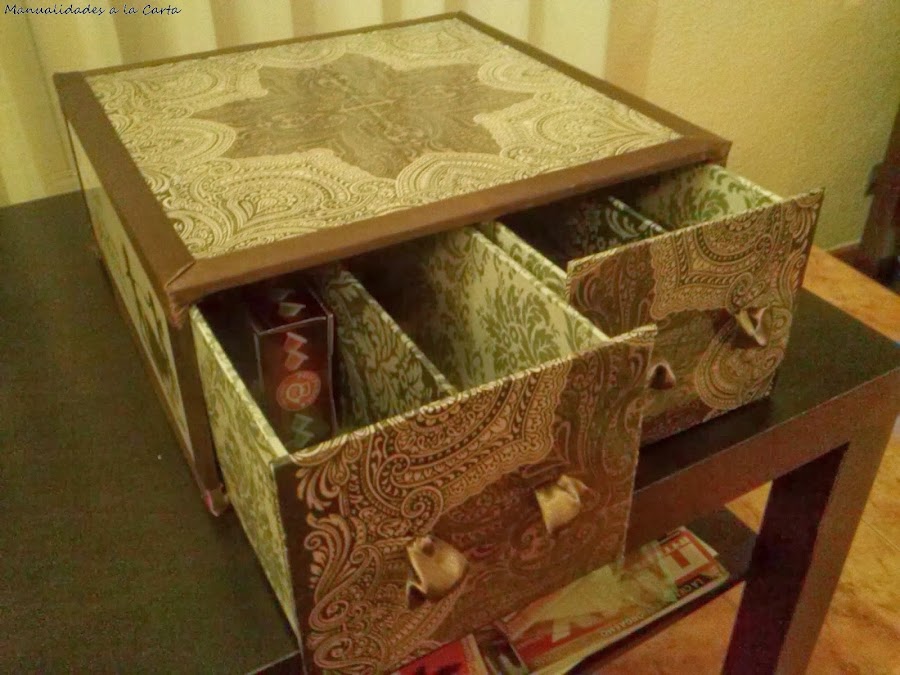 Hice esta cajonera de Cartonnage con decoración en servilletas y papeles plastificados en tonos marrones (aunque en las fotos se vean dorados jeje). Tiene dos cajones con separadores y tiradores "lacitos". Queda muy práctica y la verdad es que al "regalado" le encantó, asi que yo más contenta aún!