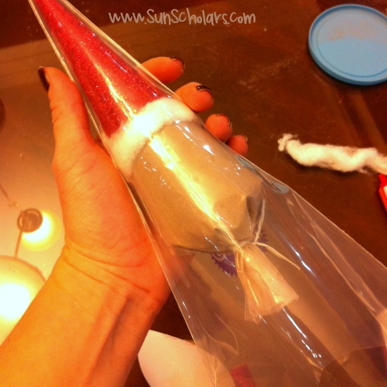 Una vez que el pegamento se haya secado (o se enfría si utilizó pegamento caliente como yo), deslizar el cacao cono lleno con el sombrero en su segundo cono de plástico.