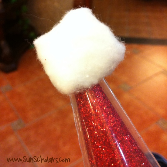 Use un poco de pegamento caliente para añadir una bola de algodón (o blanco pom pom) a la parte superior de sombrero de Santa Claus.