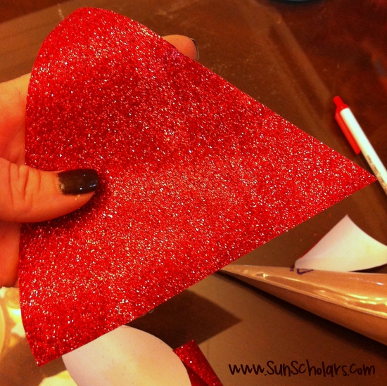 A continuación, recortar un triángulo de su papel rojo (yo usé un poco de papel de envolver brillante) que tiene una longitud tan alto como le gustaría que su sombrero.