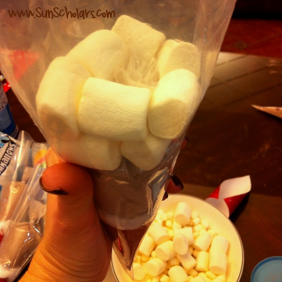 Asegúrese de que usted está poniendo los malvaviscos alrededor del extremo de plástico del cacao lleno cono!