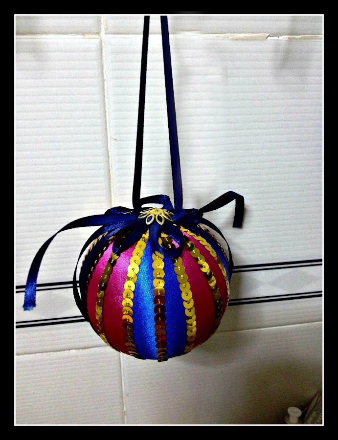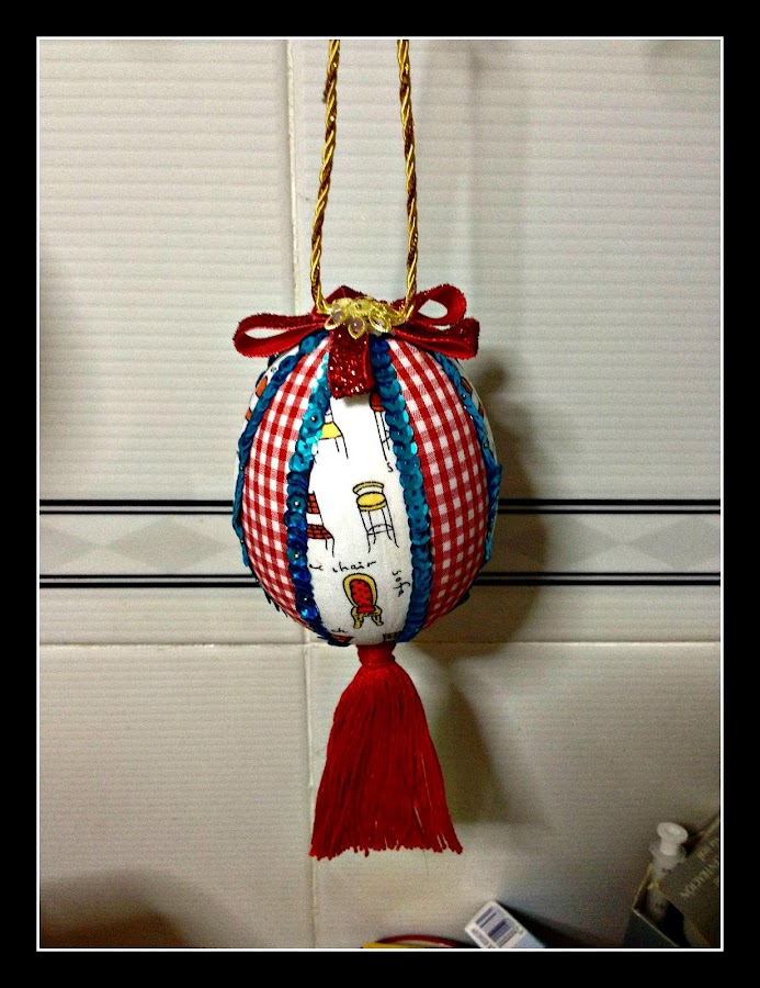 Y la última, con forma de huevo. Acolchada primero con dos telas, decorada con lentejuelas y una borla de flecos de remate.