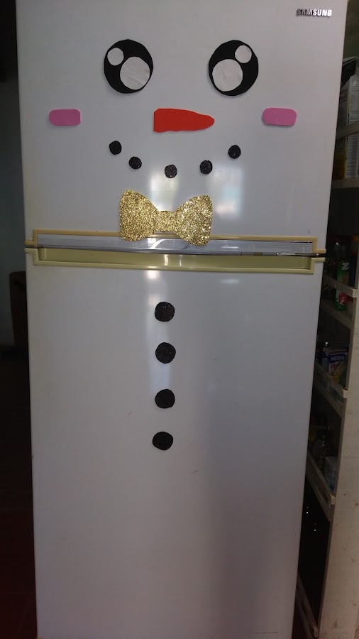 En la cocina el refrigerador se convirtió en hombre de nieve, muy elegante porque en lugar de bufanda le quedo un moño