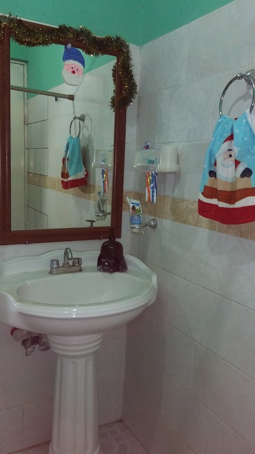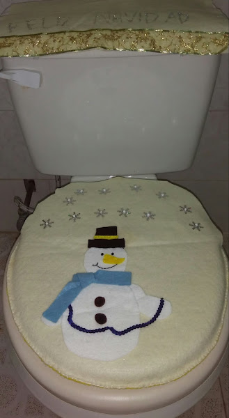 hasta el baño llego el espíritu navideño un adorno en el espejo, una toallita y un juego de baño