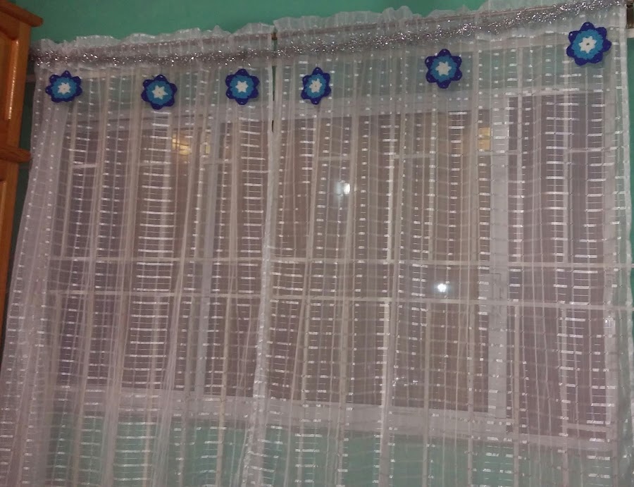 en la ventana una guirnalda plateada más las estrellas que tejí el año pasado las endurecí con suficiente pegamento quedaron indestructibles jajaja