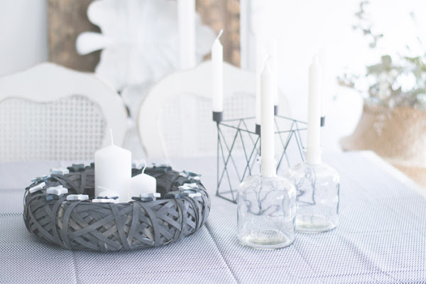 Luego coloqué todo en la mesa y organicé esta decoración para una mesa de Navidad. Colores negro, gris, plata, blanco para un centro de navidad diferente.