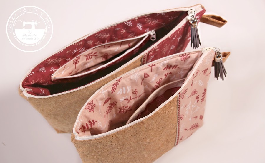 Hoy comparto contigo unos neceseres de corcho y tela con bolsillos interiores insertados que voy a usar como regalo de Navidad de una amiga que aprecia las cosas hechas a mano.