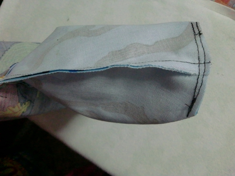 Este es el momento de coser las esquinas. Sujetamos con cada mano una pieza de la tela del mismo lado para abrirla y que se alineen las esquinas que habíamos dejado sin coser, haciendo coincidir la costura lateral y la de la base. Cosemos (yo pongo costura doble para reforzar un poco más).