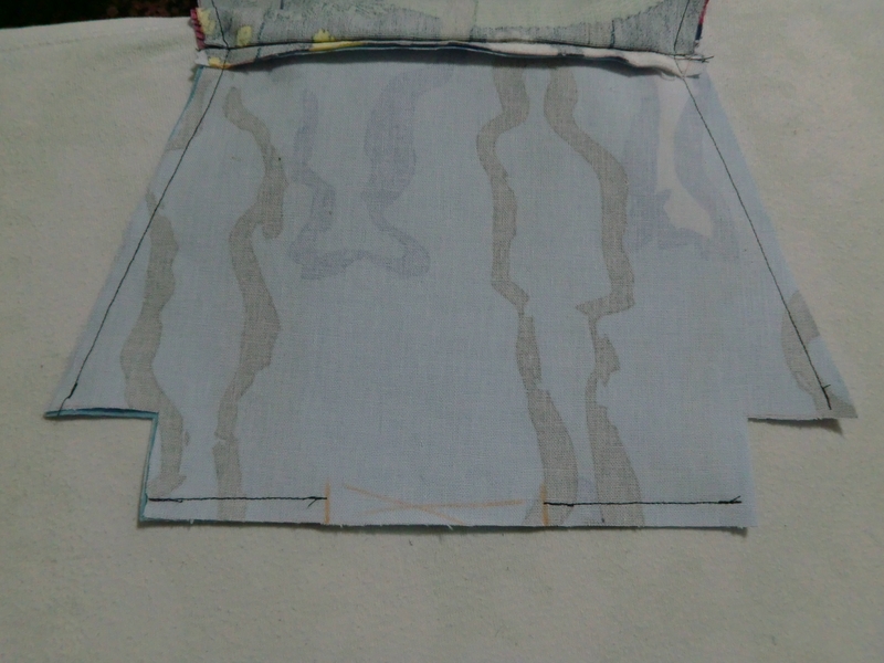 El siguiente paso es pegar la entretela a ambas piezas del forro (o del exterior, como se prefiera). Simplemente se coloca la tela con el revés hacia arriba y encima se coloca la entretela con la parte brillante hacia abajo. Se plancha (sin vapor) y moviendo muy poco la plancha para evitar arrugas. Una vez que haya enfriado se corta el exceso de entretela. Truco: colocar una tela debajo de todo esto (entre la tabla de planchar y la tela del forro), pues la entretela se pega mucho y así evitaréis ensuciar la funda de la tabla de planchar.