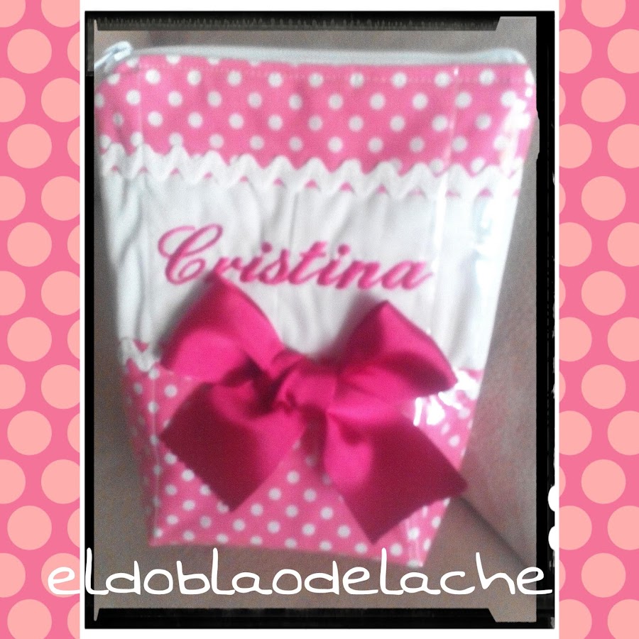 En tela de lunares fucsia y blanca y plastifi ada, para que sea más duradero.