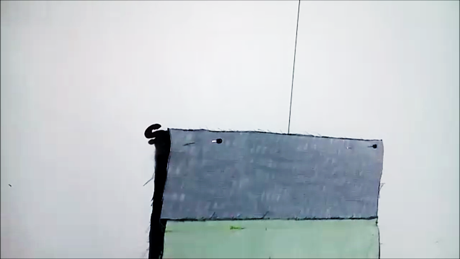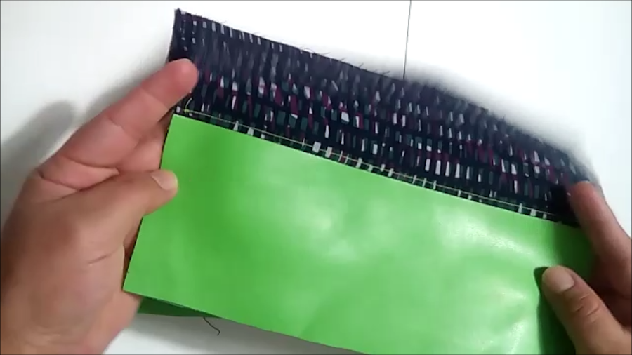 Y pasamos una puntada justo por el borde y encima de la tela de colores, así: