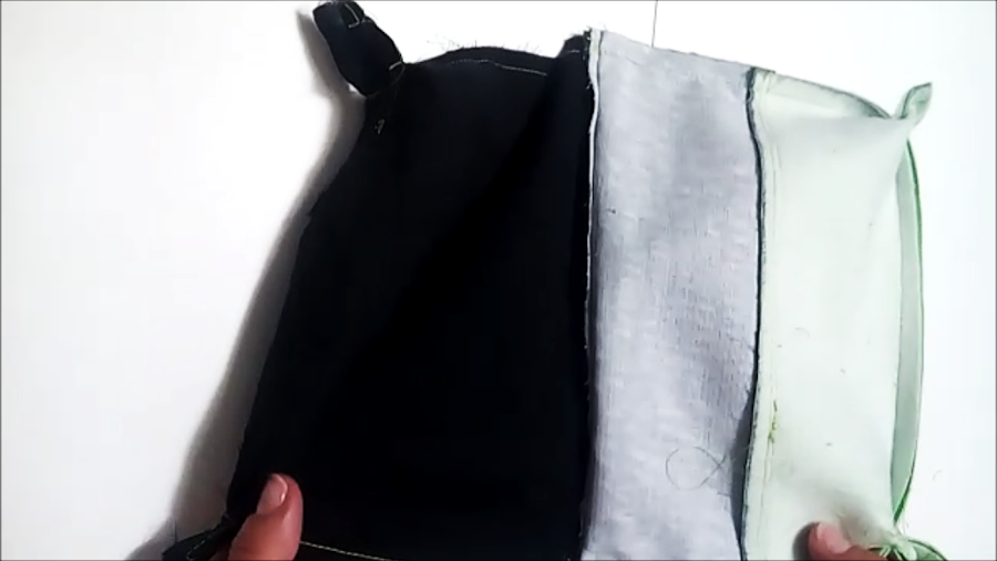 Una vez cosido, colocamos un cuadrante del forro encima de lo que hemos cosido; entonces quedaría el cuadrante exterior, la cremallera (ya cosida) y el forro que coseremos por el borde.