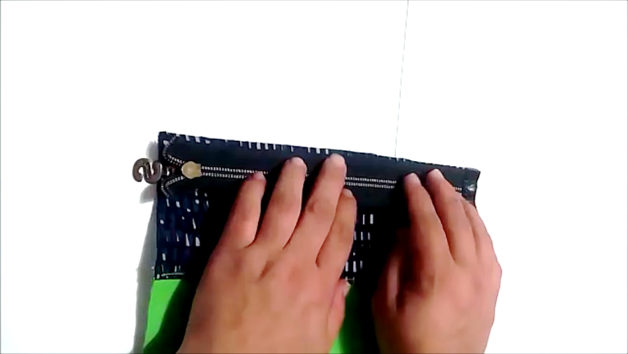 Ya con esto tenemos preparado el exterior de nuestro neceser, ahora es momento de colocar la cremallera… Entonces ponemos una parte de nuestro “exterior” con el derecho hacia arriba y colocamos encima la cremallera con su derecho hacia abajo, es decir, con la parte por donde abre y cierra hacia abajo, de forma que queden derecho con derecho, así: