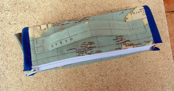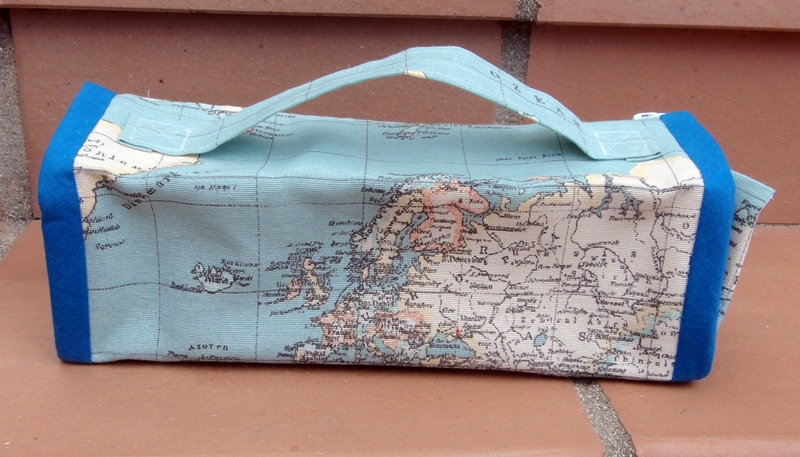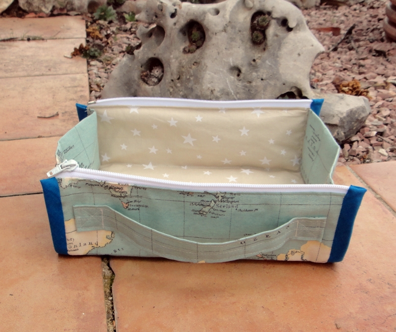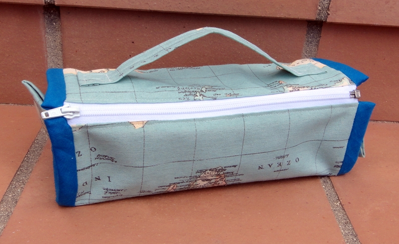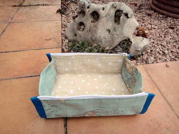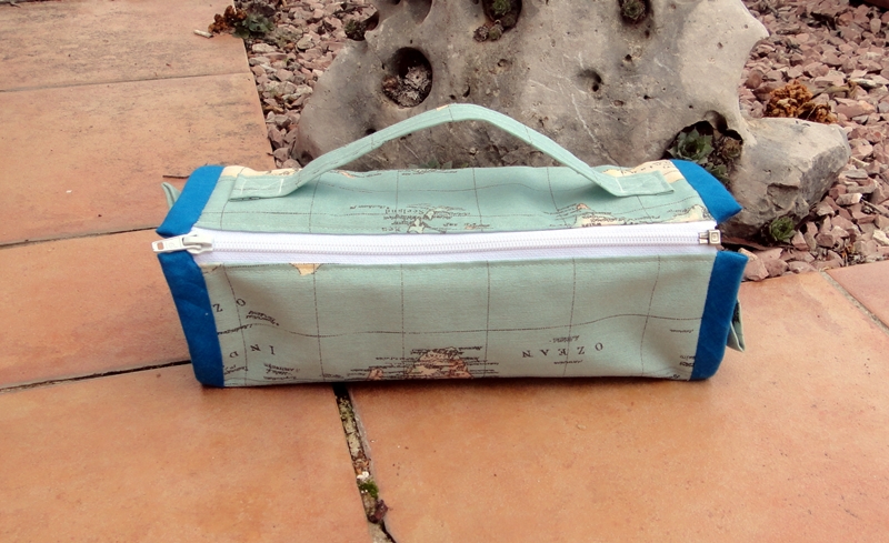 La tela de mapa me encanta. Ya la utilicé para el bolso convertible en mochila, y me quedó un retal que pude aprovechar para el neceser. Es una loneta fina, ya que lo que da rigidez al neceser es la entretela que lleva en el interior.