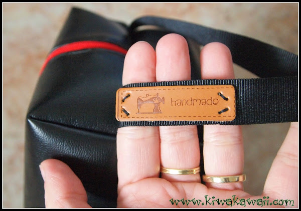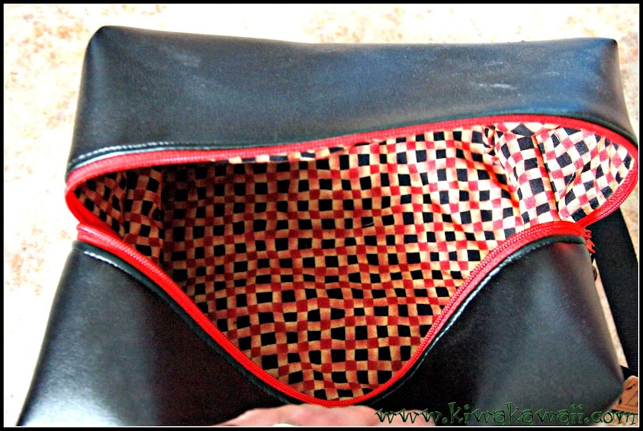 Exterior en polipiel negra, interior en algodón estampado de cuadritos. Con un ¿asa? en el que añadí una etiqueta de cuero "handmade"