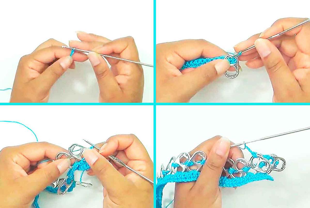 Añadir 12 anillas con el revés a la vista, por la parte más fina con 2 medios puntos, teje 2 medios puntos sin anilla y añadir la siguiente con 2 medios puntos, así sucesivamente hasta terminar la fila.