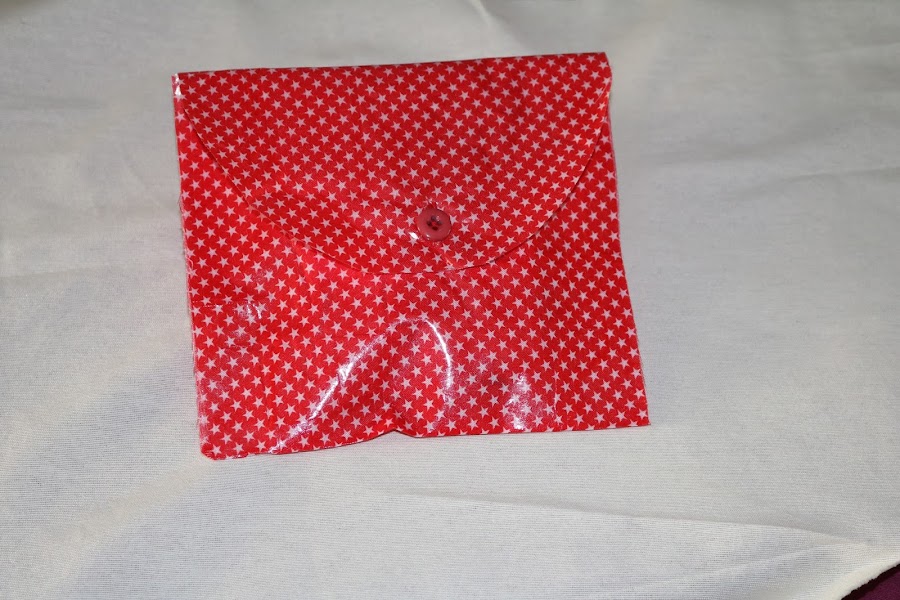 Este de color rojo, no lo he cosido, simplemente lo doblé por la mitad, dejé una solapa para hacer el cierre con un botón. Y lo pegué por los laterales con lo de los bajos de la ropa que se engancha con la plancha. Ahora mismo no se su nombre. Si lo sabéis dejármelo en los comentarios...