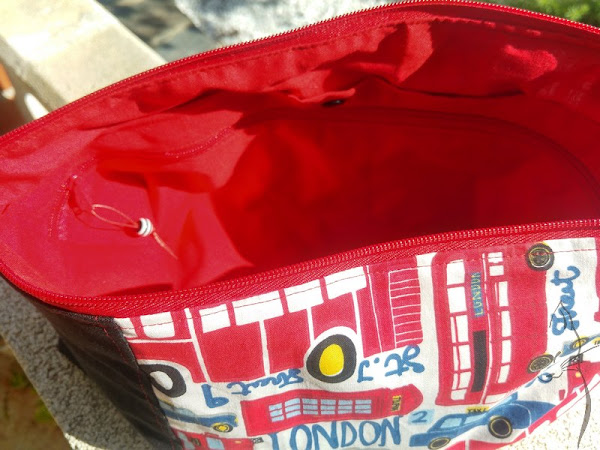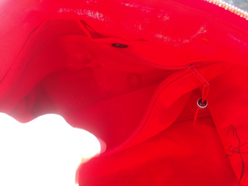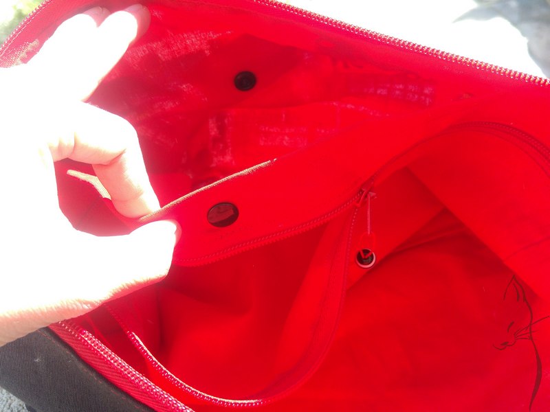 En el interior, de algodón liso rojo, bolsillo doble: uno con snap y otro con cremallera.