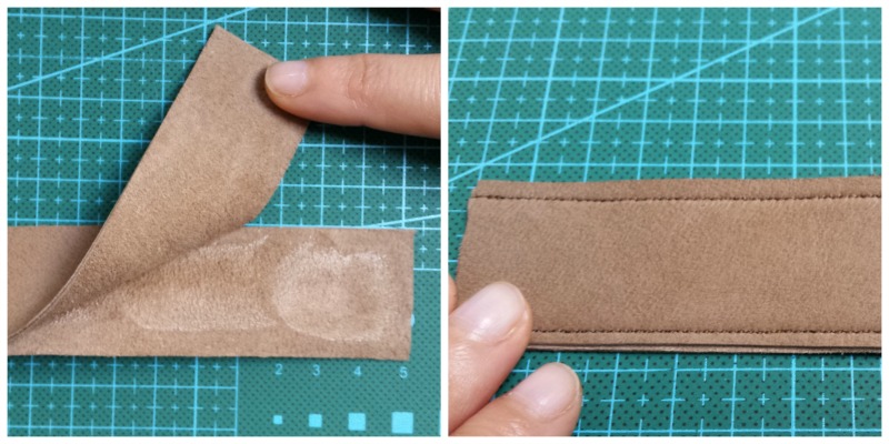 Aplica pegamento a las dos tiras de cuero que emplearemos para el asa y pasa un pespunte con la máquina de coser a lo largo de sus extremos.