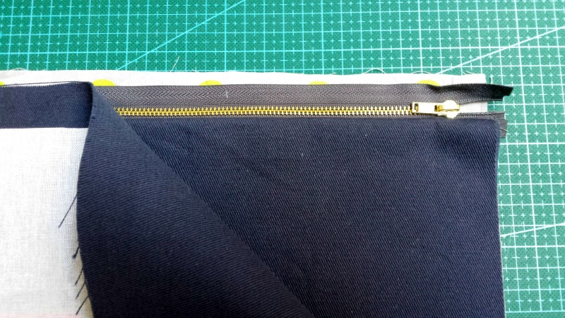 3. Por último, coloca el extremo de la tela exterior no cosido con su derecho enfrentado y alineado con la tela interior y la cremallera.