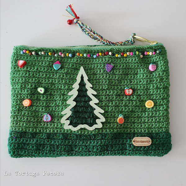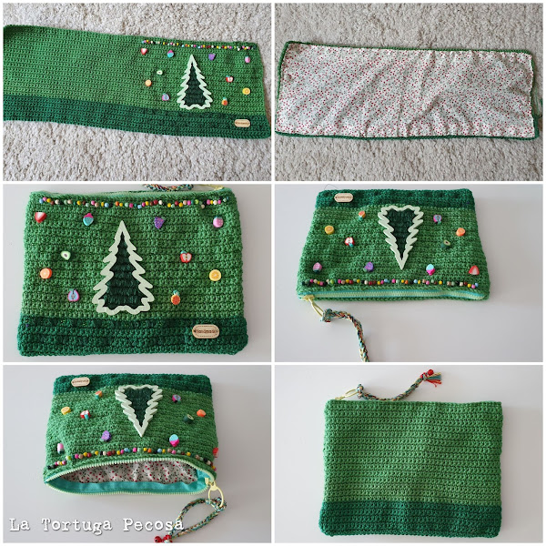 Hoy os quiero presentar otro de los neceseres de la colección de neceseres/ clutchs 100% hecho a mano, de ganchillo con hilo de algodón (número de ganchillo 3mm), en este caso a dos colores: verde hierba y verde pino con detalles cosidos representando la naturales, los árboles, la hierba, las frutas y hortalizas , forrado con tela de algodón, cremallera cosida perfectamente a mano por el Sra. Madre y con un asa para colgar de la muñeca.