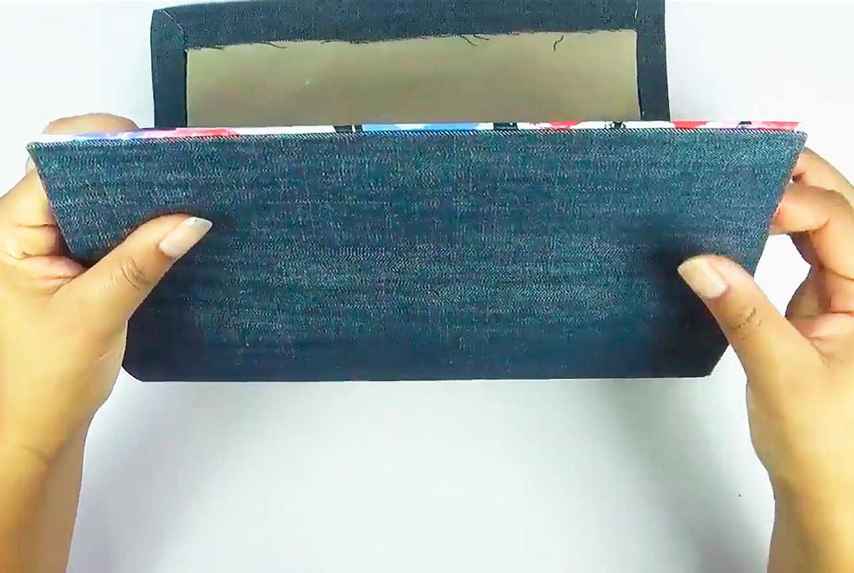 Forrar una cara de la cartulina con tela jeans, cubriendo también los bordes.