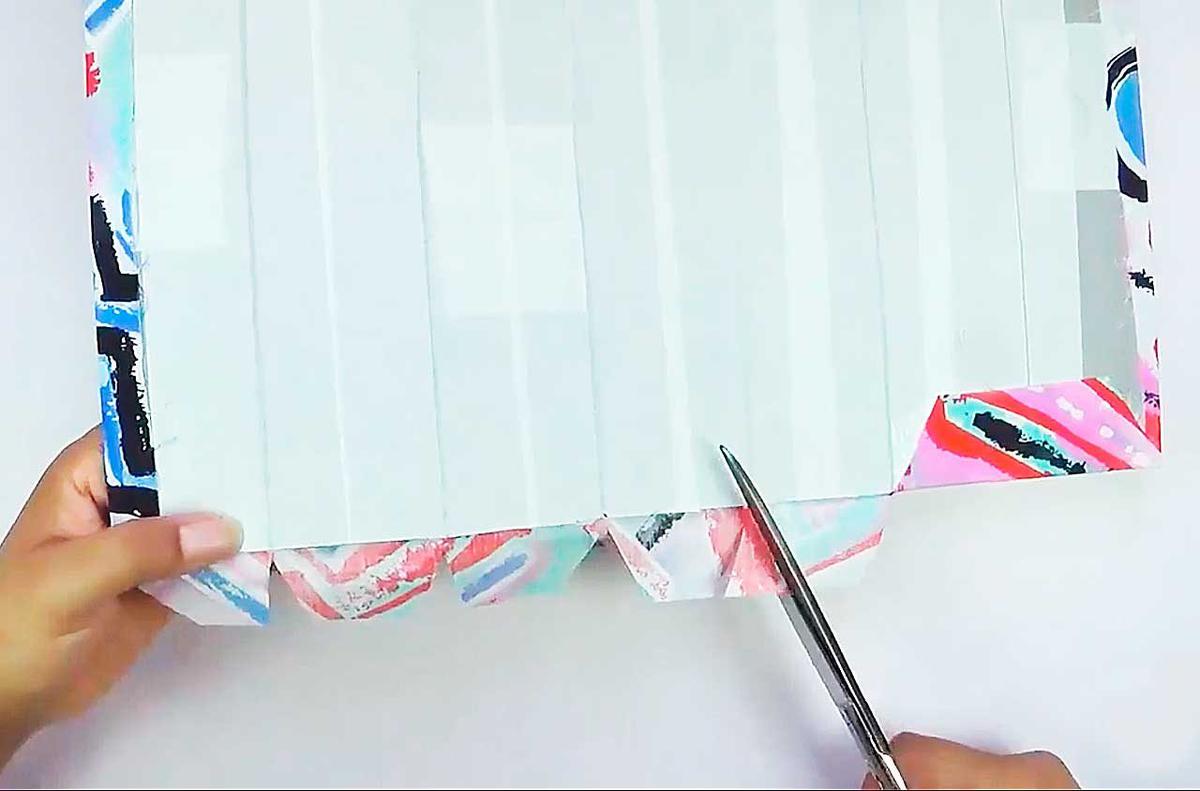 En los laterales más largos, cortar en “V” los sobrantes, guiándose por las tiras de cartón, EXCEPTO las dos primeras, que deben coincidir con las del otro lado, ya que éstas serán las tapas.