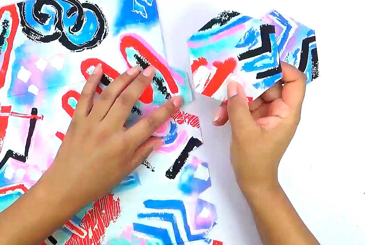 Pegar los hexágonos en los laterales y cada pestaña de jeans, pegar al neceser.