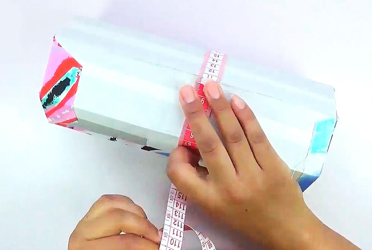 Cortar una pieza de cartulina con la medida del contorno, desde la solapa a la abertura de la tapa y del ancho del neceser.