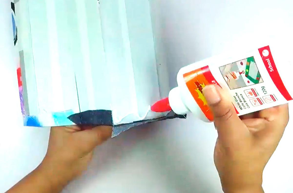 Pegar en los laterales de la pieza grande, a partir de las pestañas de tela que dejaste (no pegar en la parte de la tapa y la abertura, que son las dos primeras piezas)