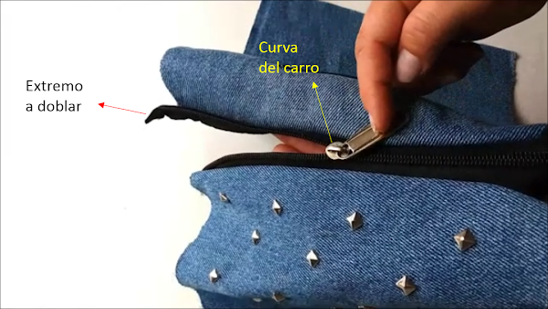 Ahora sacamos el carro de la cremallera, pero antes debemos hacer un doblez en el extremo de la cremallera donde apunta la curva del carro de la cremallera; te lo muestro en la foto: