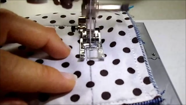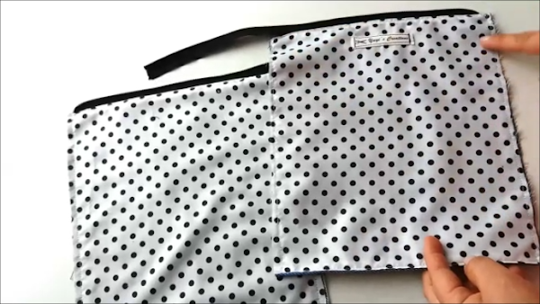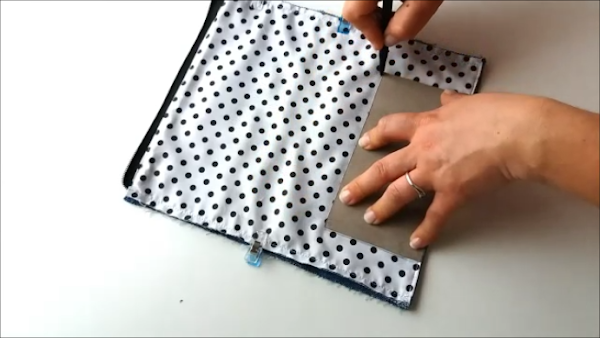 Damos la vuelta a ambas piezas y planchamos de ser necesario. Luego pasamos otra costura por todos sus bordes, empezando por el borde superior (el de la cremallera), seguimos con el inferior y luego por ambos lados, de ésta forma no quedará descuadrado. Lo que buscamos es cerrar ambas piezas por todos sus lados. Así debe quedar: