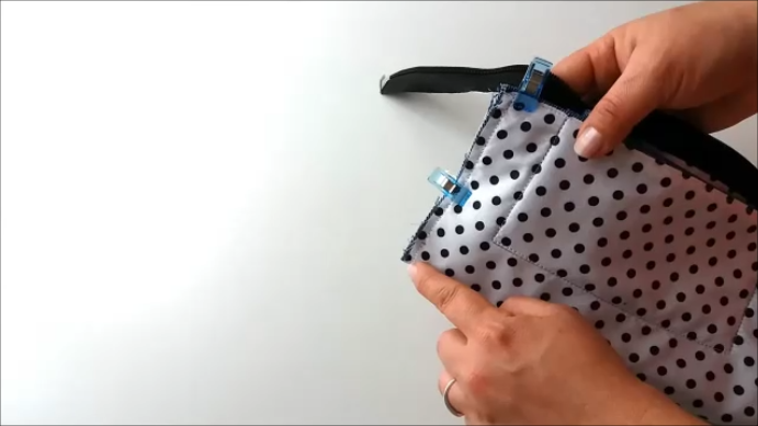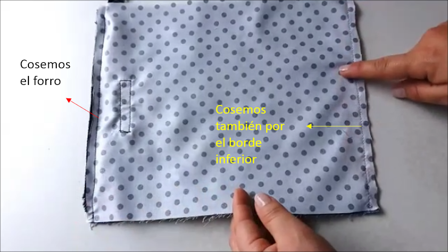 Seguimos con el forro, el cual vamos a poner encima de la tela exterior enfrentando los derechos de ambas telas y hacia el borde.