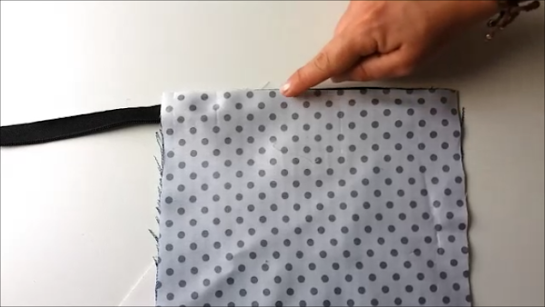 Con la otra pieza hacemos lo mismo: Llevamos el derecho de la pieza de tela hacia el borde libre de la cremallera, y cosemos como hicimos antes, así: