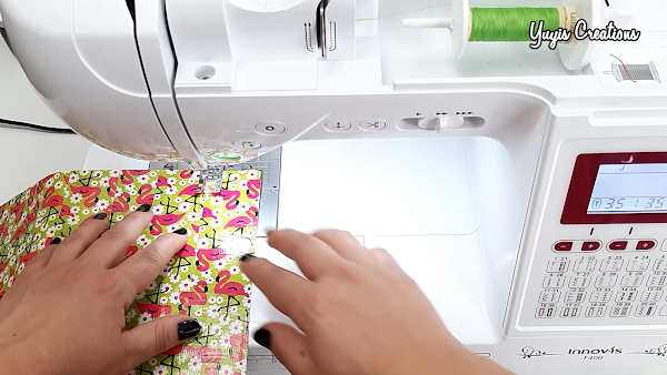 Se coloca el neceser del revés y se cosen los laterales, incluyendo el área de la cremallera. Hecho esto, se corta el sobrante de cremallera y se le hace el fondo. Para hacer esto se sacan las esquinas y se cose recto a 2 cm desde la punta, así: