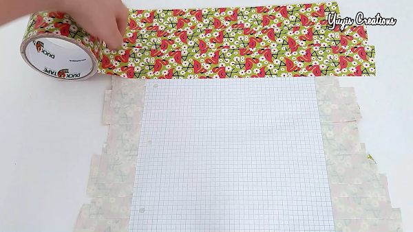 Luego cortamos el sobrante de cinta adhesiva usando otra hoja de papel como molde y pasamos unas costuras por cada unión de la cinta.